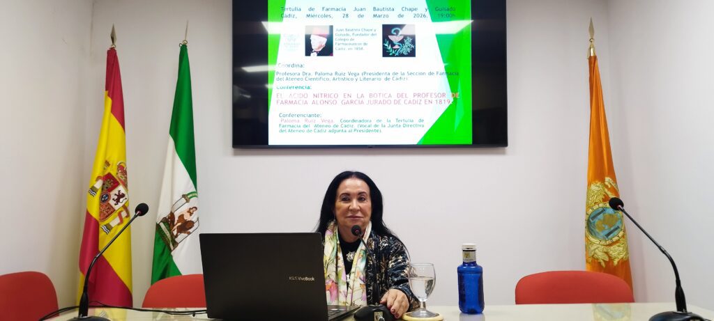 Esta tarde miércoles 25 de marzo de 2026 a las 19:00h se celebró la Tertulia de Farmacia Juan Bautista Chape y Guisado: “El ácido nítrico en la botica del profesor de Farmacia Alonso García Jurado de Cádiz en 1819”.